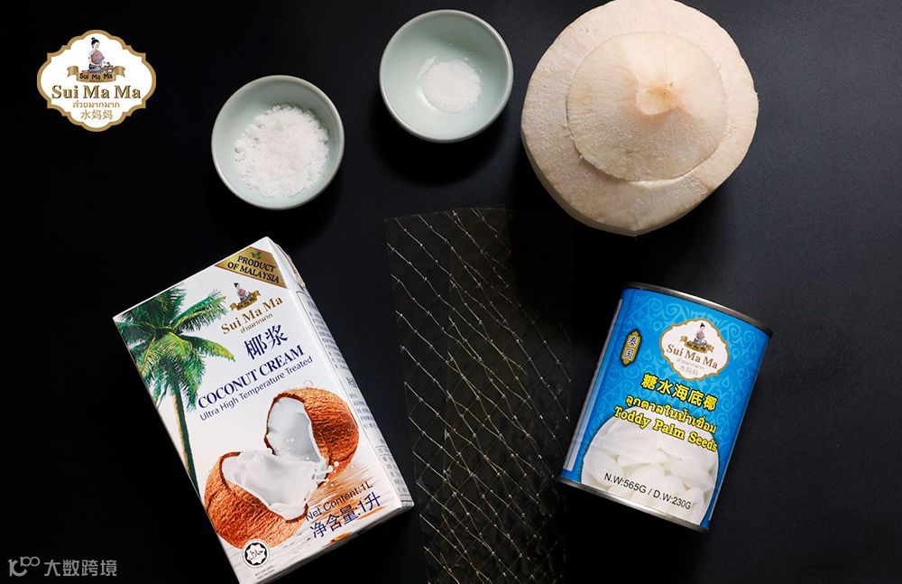 1.食材准备. 水妈妈椰浆,椰青(或者布丁杯做为容器),适量糖、盐,水妈妈海底椰,椰子片。