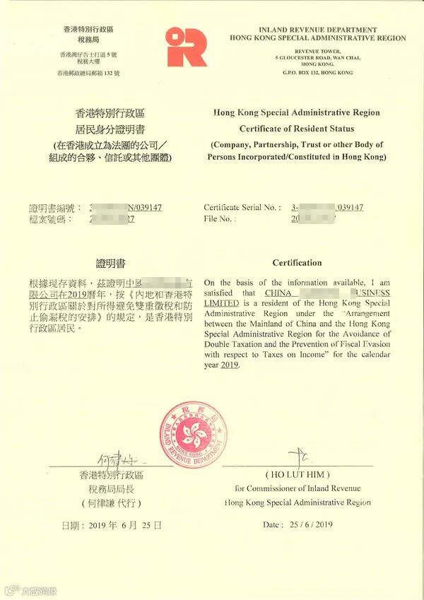 香港税务局对申请人填报的申请表进行审核后,为申请人开具居民身份证明书。法人居民身份证明书按在香港成立的居民法人和在香港以外成立的居民法人两种情况分别开具。