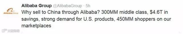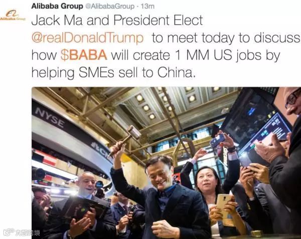 会面结束后,阿里巴巴的官推发文称“阿里巴巴希望,通过把美国的小商品贸易和农场产品推向中国,在中国的3亿强有力的中产阶级群体中销售,来帮助美国创造更多的就业机会。”