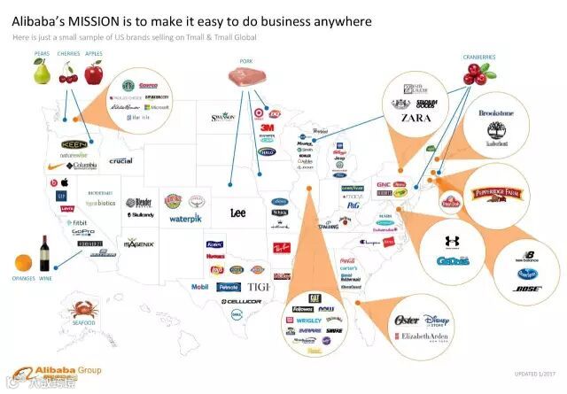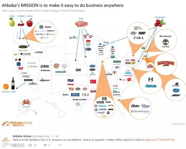 在官推上,阿里发布了一张图片,展示已经登录阿里平台的美国企业。在未来几年里,阿里希望能吸引更多的美国品牌。