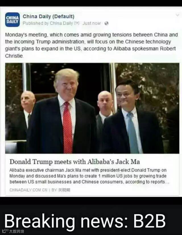 马云称赞特朗普“非常聪明”“乐于倾听”,并描述了阿里的计划,即吸引一百万左右美国的中小企业在阿里的平台上进行销售,将其产品卖给中国的消费者。据估计新增加的业务能使每个企业多雇佣一个新员工。