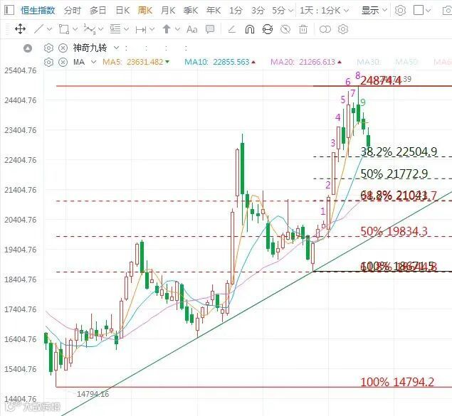 港股科指由3月7日高位6195點開始回落,是自1月13日行情以來的第一次10天線跌穿20天線,因此判斷科指至少是針對1月13日低點級別的調整。上周分析恒指也會走針對1月13日18671點的調整,所以上周的正常調整,基本到了22500區域附近。由於目前市場正遭遇到大事件干擾,受週邊股市下跌影響,港股下週一市場低開難免,下週一主要看低開的幅度,以及低開後反彈的力度。後市,恒指注意20周均線即21000附近的支撐不能跌破。