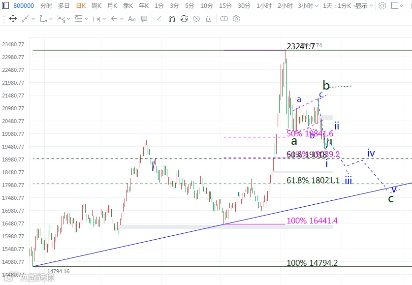 我们在上周行情展望分析中指出,恒生指数与A股高度同步,预示仍处于c浪下跌中。结构上,恒指从23241开始的调整,应该是至少是针对16441的2浪调整开始。后市注意9月26日留下的19002-19072岛形反转裂口的支撑。我们分析又指出,周初会有针对21355的反弹,只是想到市场反弹太弱,仅反弹了1天,高度也仅仅接近0.236比例的19800附近,呈现弱反弹行情。我们在周四行情简评中提示注意恒指19500支撑力度,支撑不破,后市还会再反弹一下,满足ii浪反弹结构。指数跌破19500后单边下跌,创出调整低点,宣告这一次的ii浪反弹结束,iii浪下跌途中,后面的调整还要继续。大家可别忘了,我们在周末出图时就明确恒指只是一个小ii浪反弹。既然是二浪反弹,ii浪反弹过后肯定会有三浪下跌。所以看到破前低的3浪下跌,没什么稀奇的,因为根据波浪,一切尽在预料之中。后市还是耐心等待这次c浪调整结束之后的中线布局机会。