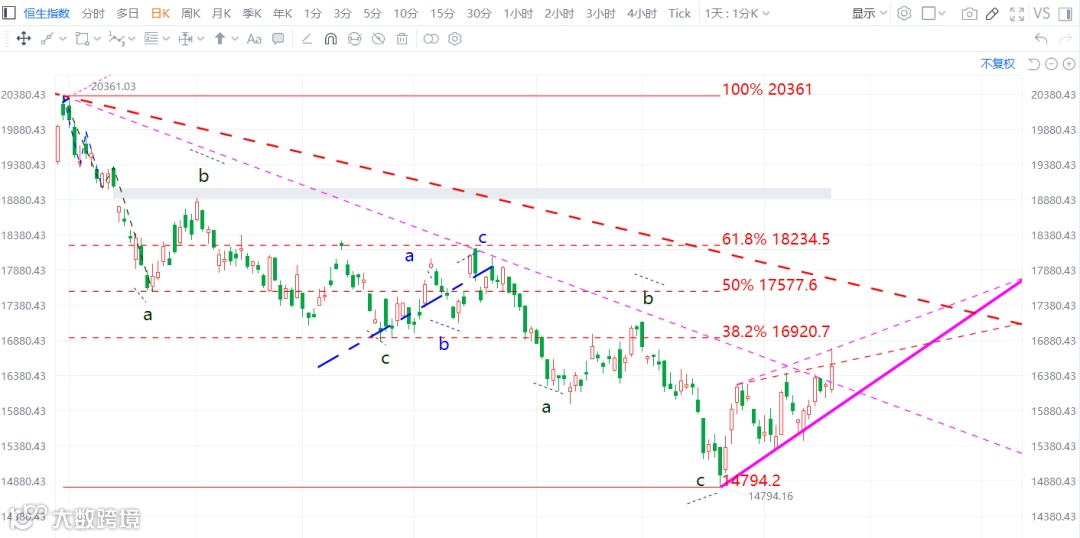 港股市場今天也是低开高走,上午出现普涨行情,午后高位回落,全天冲高回落行情。恒指早盘向上突破一直以來提示的由20361與18174兩點連線形成的壓力線後大漲。盘中冲击167xx点的100日均线,结果铩羽而归。盤前節目中我只強調恒指16064不破繼續看向上,並沒有明確今天的波幅,還提示DMI的adx數值如果拐頭就有趨勢行情,現在回看分析沒錯。午间分析提示述,港A兩地市場既然出現趋势扭轉,那么大盘任何的调整都是上车的机会。恒生指数今日冲高回落,又让不少人忐忑不安,患得患失。恒指上周五反弹到60日均线止步,短暂调整2天后今天突破,又受100日均线压制而回撤。由于60日均线趋势仍然向下,如早盘Jep Morning節目中分析,需等20/30日均线与50/60日均线发生金叉中期趋势才能确认。结构上,恒指14794低点起来的反弹貌似走楔形结构,注意14794低点与15336低点连线形成的反弹上涨轨形成的支撑,支撑轨不破,恒指按其模式震荡向上。初步估计恒指针对22700高点的反弹(或保守针对20361点的反弹)应在17000点之上才可能结束第一波反弹。