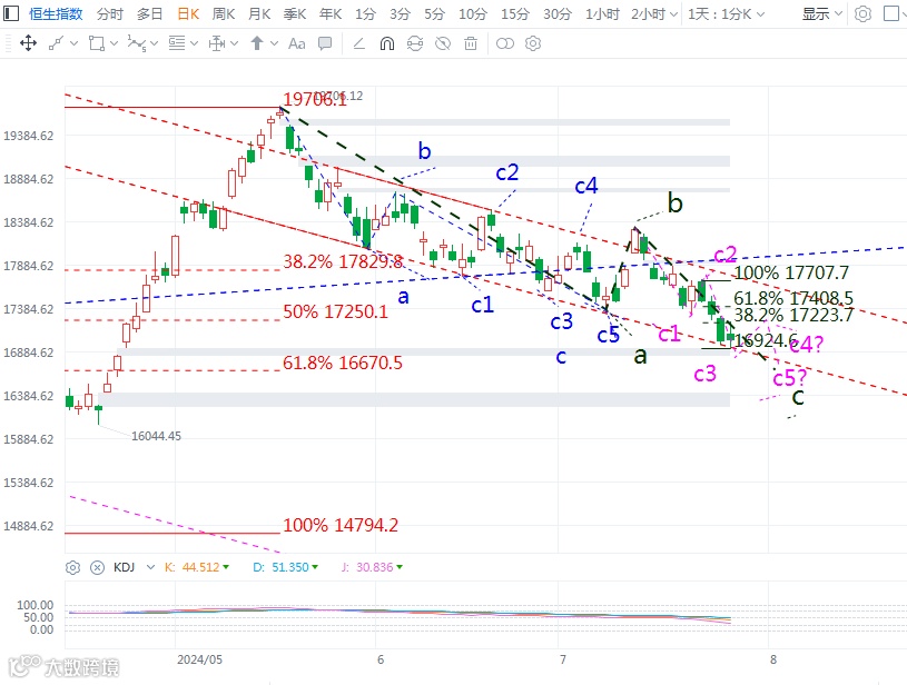 港股市场,恒生指数连续两周下跌,累计跌幅1272点。两周跌幅接近6月份的波动幅度。恒生指数浪形划分如图所示:从18317高点开始的调整,属于承接19706点开始的调整,目前进入c浪下跌阶段,由于之前19706-17376波段的a浪下跌已经释放了很大的风险,所以c浪已经开始有超卖出现,下周先注意大波段0.618比例关系的16700区域能否止跌企稳和有否反弹出现。我们前期行情展望分析指出,恒指由19706高点开始的调整注意17443-17600区域的支撑力度。特别是当科指跌破3700点后,我们就将恒指的调整定义为至少是大级别的2浪调整,目前恒指一再破位下跌,下周注意16700区域最后防守位不能有效跌破,否则还将继续寻底。