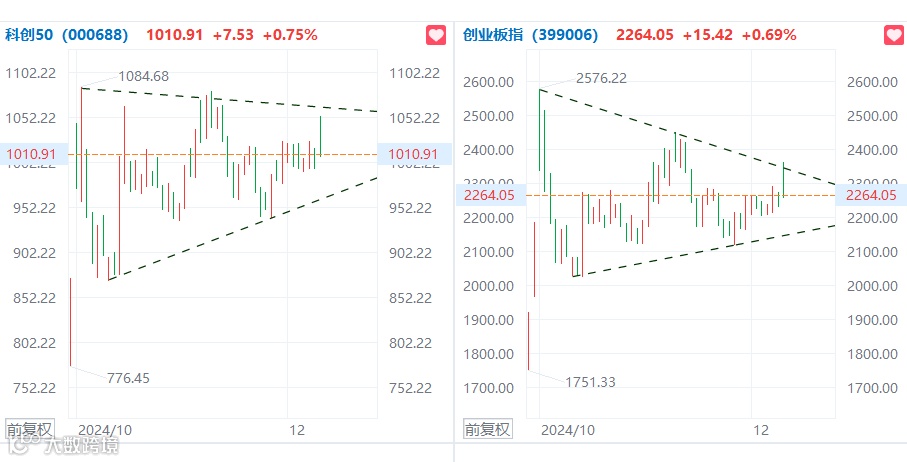 受消息影响,A股高开后激活前期抛压,全天震荡走低,几乎复制了10月8日和11月8日两个前期高点的走势。如图所示,消息只影响市场开盘不影响结局,指数始终按其技术特征运行。创业板指数收盘没能有效突破站上2323反弹压力,科创50指数也没能有效突破站上1030反弹压力,还是延续在之前的三角形形态内运行。
