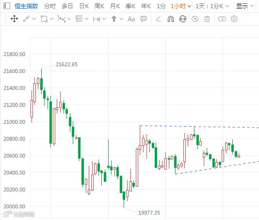 恒生指数见199773低点后结束第一波调整展开b反弹走势,最高见20952点,b浪反弹较为可惜的是没能突破20975前高点。恒生指数调整中低见20380的低点,险守针对19977的0.618极限位置,短期形成低点抬高,高点降低的收敛三角形的形态,短期暂时无法判断突破方向,所以也不确定b浪反弹是否已经结束,后市是否还有b浪反弹高点。但可以肯定的是b浪反弹的后半段不会流畅,高度也有限。如前期技术分析,恒指的b浪反弹的高点在212xx-216xx-21200区间,不知道能不能到达212xx区域。下周是期指转仓和结算时间,结合如果走三角形形态,那么下周初恒指将维持窄幅波动,等待后市的方向突破。如果恒指不是三角形的形态,那么短期继续注意20380强弱。