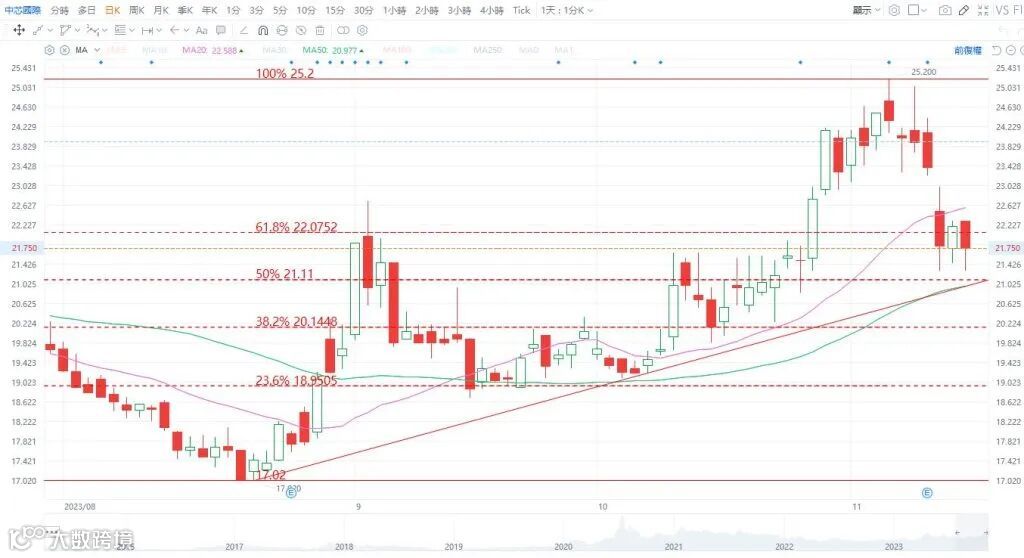 周三中美两个元首会面,美国上月突然宣布最新AI芯片管制提前生效,未知今次见面美方会否释出善意,放宽相关管制。有内地媒体报道指,美国最大芯片制造商英伟达(NVDA)爲中国推出最新改良版AI芯片,预计会在今年11月至12月送样,今年12月至明年1月量产。近年全球半导体业掀起「逆全球化」潮流,过往每次美国加强限制输出高端科技芯片,反而利好内地晶圆代工龙头中芯国际(981 ),其股价在过去3个月逆市升近两成,上周五公布业绩逊预显著回吐,目前股价由高位25.2元回调近一成半,今早跌至上周五低位21.3元再度获支持,技术上则守在17元(8月22日低位)至25元回调升幅一半水平,以及8月及10月低位连接至今上升轨,同时亦是50天线约21元支持位,守稳的话有望重拾升势。即使跌穿,相信再落幅度也不会太多,下一支持为回吐升幅61.8%黄金比率及100天线约20.1元。