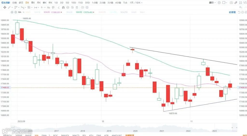 隔晚美股在最新通胀数据出炉前个别发展,道指反覆靠稳连升第二日,收市升54点或0.16%,标指微跌0.08%,纳指跌0.22%,三大指数在反弹高位震荡,成交缩减。道指最先突破近三个多月的下降轨,纳指则在上周五突破,标普500指数昨日略破该降轨出现争持,整固后再上机会大。大落后的港股昨日先跌后升,恒指终止上周连续4个交易日的跌势,低位17126点刚守在上月至今上升轨,尾市发力倒升逾200点收17426点,重越20天线。科指跑赢,急升2.3%收近4000点关报3981点,两指数均以阳烛「破脚穿头」形态回升,上周的调整有望结束。恒指昨守在近个多月营造的收窄三角形底部回升,于ADR续升势,收市升90点报17516点,恒指今早高开69点报17495点,升至17565点便止步,11时过后倒跌,在20天线约17386点附近好淡争持,低见17358点,中午收报17408点,微跌17点,半日成交金额约430亿,较昨日多两成四,回吐压力加大。