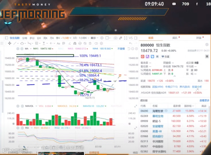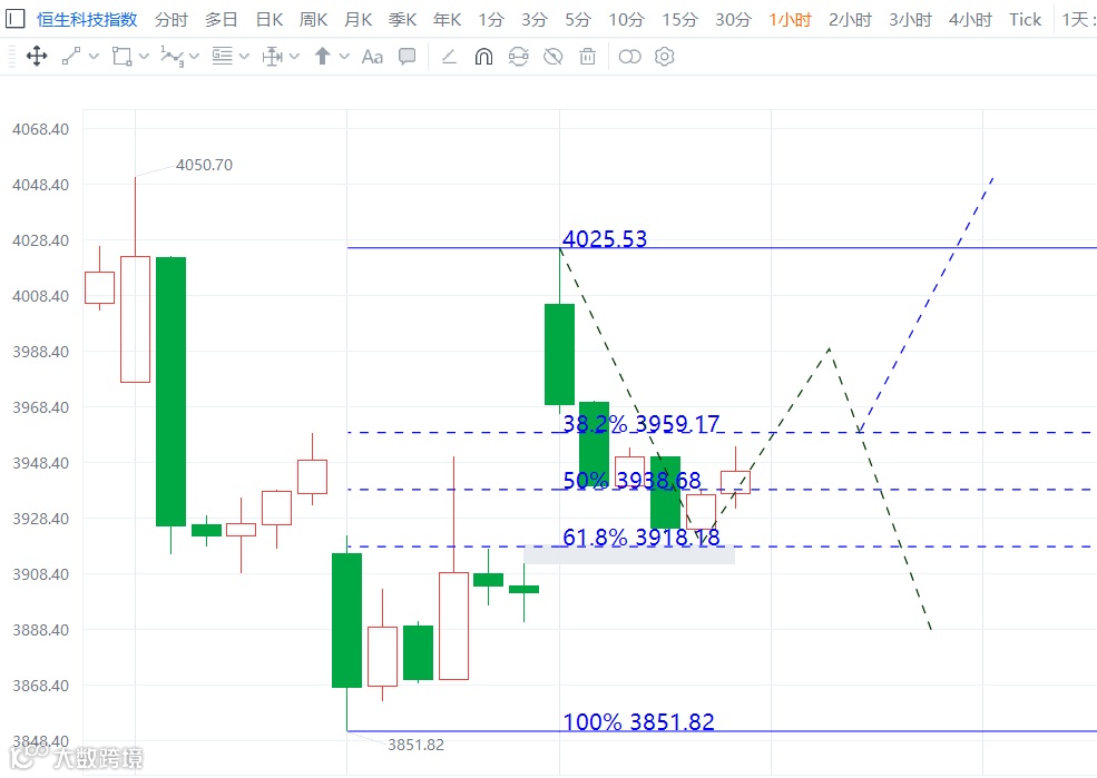 恒指在昨天反弹基础之上今天继续反弹,只是反弹高度稍弱于出图预期。科指走势仍然稍强于恒指,仍然保持在2720与3563两低点连线形成的上涨趋势线之上,反弹趋势仍在。明天科指支撑位由3918提高到3967,支撑不破,反弹继续。同理,恒指支撑位也提高至18565点,极限不能再见周一的184xx低点。