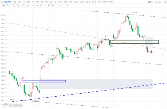 恒指早盘破位低开,留下跳空裂口,全天震荡下挫单边下跌。恒指分时调整速率很快,3天时间反吞没之前3周涨幅的一半。如图所示,恒指本轮从18044低点起来的第一波反弹到20155开始调整,在18465-18525留下“岛型反转”裂口(图中蓝色框),今天又在19436-19504留下另一个反向“岛型反转”裂口(图中黑色框),到底哪一个更具威力,哪个会被补掉,留待后市验证。短期而言,恒指注意能不能止跌反弹,看能否回补今天留下的裂口。下方注意18850-19100区间的支撑。