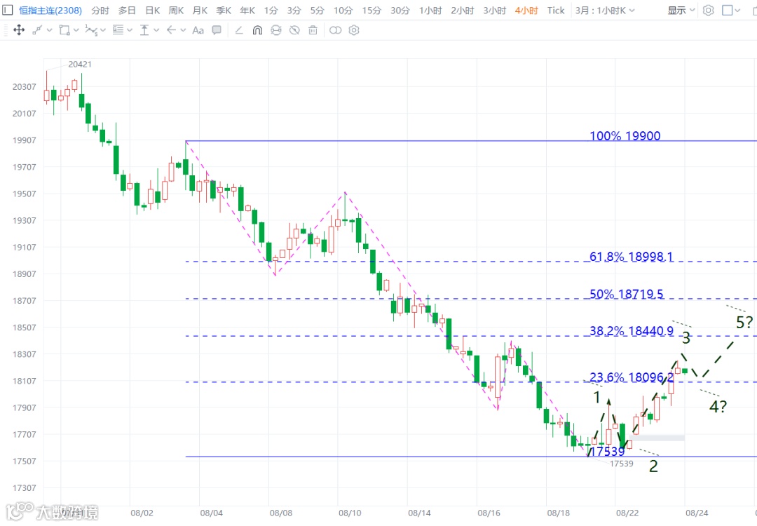 恒生指数上周连续3天反弹后,受压于10日均线,周五调整走势。调整中,恒指最低17956点,重叠了上周二反弹最点17965点,结构上,上周的反弹走不出推动浪,除非上周五的调整是3-2浪调整,下周一快速大涨走3-3主升浪。所以,恒指下周先注意17840区域支撑强弱,支撑位不破,还有复杂的反弹。