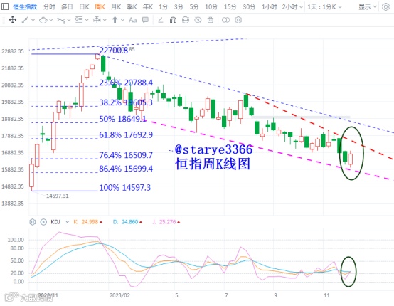 恒生指数上周一先探底,见全周最低15972点,创出年内调整新低后走出探底反弹行情,周K线收报几乎是反包的阳线,有短期见底曙光初现的味道。恒指年初见22700高点后,全年走出单边下跌的调整行情,而且走势明显弱于科指。技术上,如果最弱的指数出现止跌企稳,对后市行情也会产生积极影响。恒指本周就有技术看点,一是周K线出现曙光初现组合,二是KDJ技术指标周线级别出现底部金叉。很多时候,当周KDJ技术指标从底部超卖出区域勾头向上且收周阳K线时,机会女神便会降临。所以,下周恒指注意下方19350点的支撑,或者15972与16145两低点连线形成的支撑,如果回踩确认支撑有效,一波反弹行情便会产生。科指走势参照恒指,如果恒指能走出弱势,科指走势不会差。
