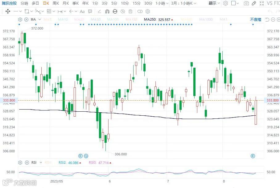 腾讯季度经调整盈利按年升33%至375亿元人民币,优于预期,惟收入仅上扬11%至1492亿元,较市场估计的1520亿元低,按季更下跌1%,乃受累网游业务放缓,不过管理层表示第三季将恢复增长。腾讯股价今早低开2.5%,幅度少过ADR,且开市价320.6元已是最低位,之后曾倒升逾2%至335.8元高位,中午收333.8元,升1.5%。在腾讯倒升带动下,恒指也逐步收复失地,由低位回升逾400点,一度倒升3点至18332点高位,中午收18308点,微跌21点,科指则倒升近1%,收报4164点,早段低位4023点,守4000点关口。半日大市成交约620亿元,较昨日多近两成半,捞货搏反弹者众。