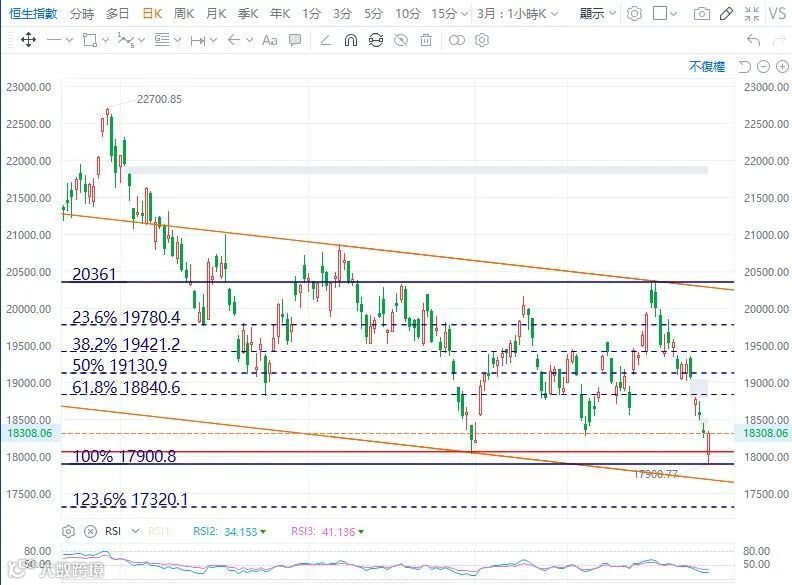 内房债务与信托市场危机继续困扰港股市场,在中资金融股被抛售拖累下,恒指昨日再跌251点,收报18329点,四日累挫近千点,14天RSI跌至34,今日再跌便进入技术超卖区。另外,腾讯(700)次季业务增长没有惊喜,股价于ADR挫逾3%拖低指数。恒指今早低开逾300点报18023点,跌穿前低18044,最多跌429点至17900点关口喘定,守盘前预期的初步支持位。