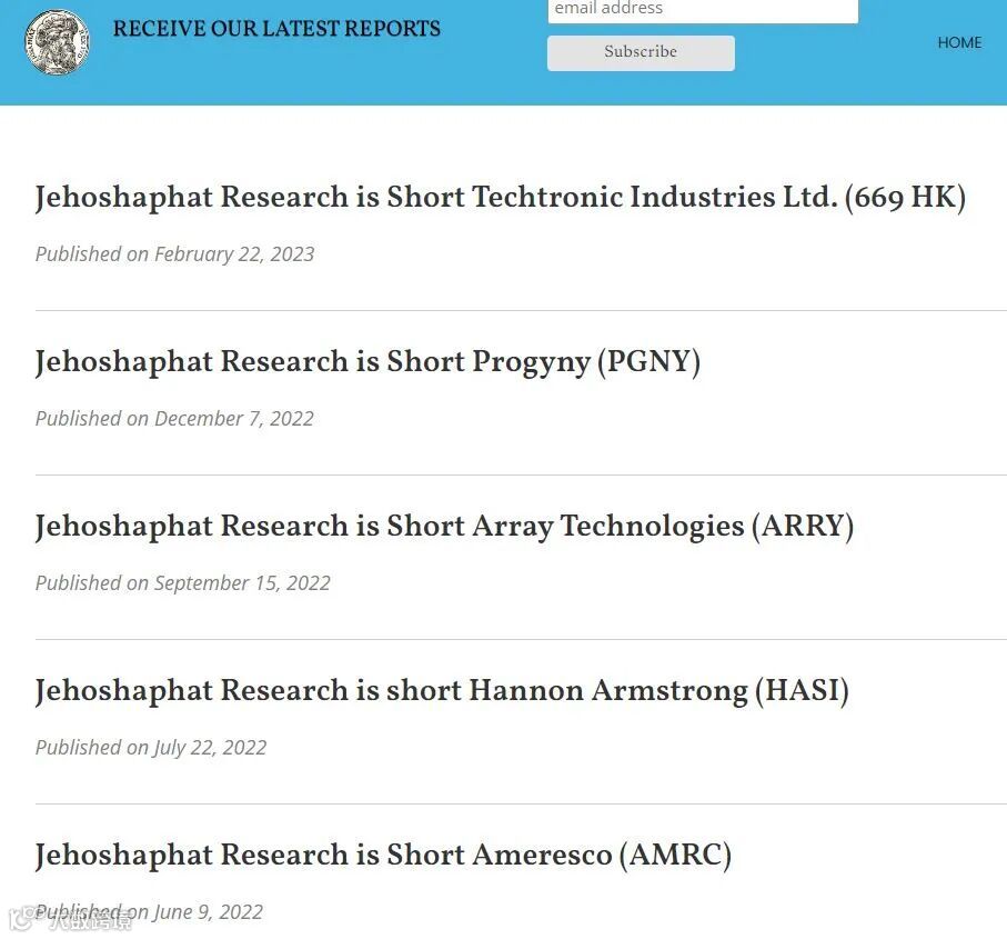 在Jehoshaphat Research官网找了他们做空的股票,Progyny (PGNY)、Array Technologies (ARRY)及Hannon Armstrong (HASI)等股。