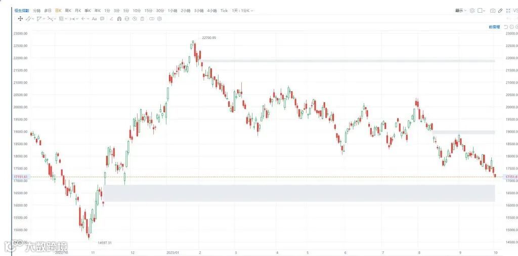 昨日美国10年期债息已攀上4.7厘以上的16年高位,亚洲区股市几乎全线下挫,恒指在第四季首个交易日开局大跌,把上周五的升幅跌凸,并再创去年11月以来低位。外资继续减持港股,恒指弹1日又破底,昨日跌市成交金额达861亿元,在没有北水下已算多,来自外资的沽售压力进一步加大,大市未有止跌迹象。不过由于昨日港股先跌,昨晚于ADR再跌有限,今早恒指开低开64点报17266点,开市又是早市最高位,但跌至17107点便反弹,跌势较昨日温和,好友守在17100关前,惟反弹力度也有限,早市高低波幅不足200点,中午收报17151点,跌179点或1%。恒指继续向下寻底,若17000关失守,10月恐要进一步下试16000关,把去年11月10日及11日留下,阔近700点,介乎16138点至16829的大裂口全部补回。