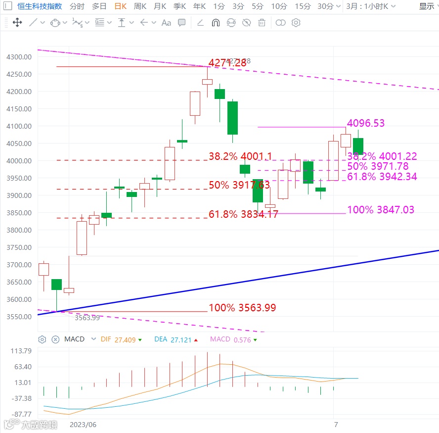 恒指今天低开低走,收报阴线。昨天设想太乐观,以为先冲高才回落,从今天調整幅度看,恒指至少是一波反弹后的b浪调整,明天注意19030支撐力度,期指注意18944支撐力度,支撑位之上应有反弹。如果調整破支撑位,后市则需注意14597与18044两个低点形成的上涨趋势线,以及18465-18525裂口的支撑强弱。科指先注意4000整数关口支撑,极限注意不破3942就可以。主观上,如周末行情展望分析,整个7月份恒指依托14597与18044两个低点形成的上涨趋势线守住18465-18525裂口,继而反弹的概率大。