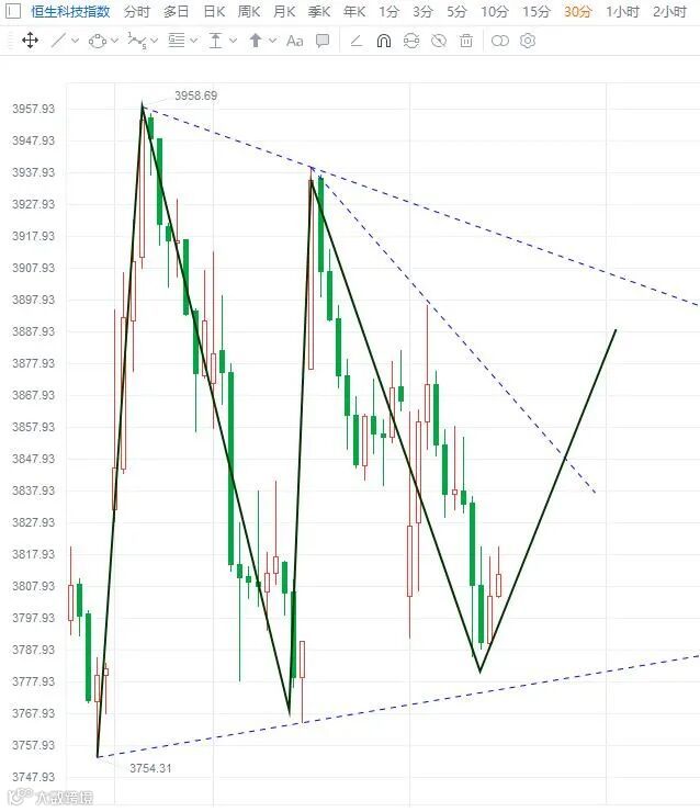 恒指早盘随夜期低开后全天低位窄幅震荡,最低点没有跌破夜期创出的低点,科技现货也维持三角形整理形态,行情走势基本与Jep Morning节目观点相符。结构上,恒指分时有小双底雏形,注意看夜期能否也做一个小双底结构。恒指本周每日大幅震荡,而周波动却仅有800点,市场有波幅没有涨跌幅,长跌之后有反弹需求。今天也是港股这波调整34天时间窗口,出现短期低点的概率也高。明天,只要反弹过了5日均线19400点,估计短期反弹开始了。