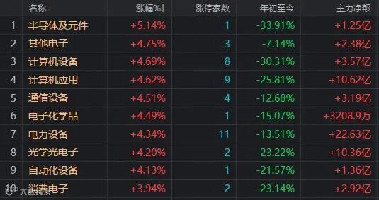 盘面上,只有景点及旅游板块下跌,其他行业板块悉数上涨,其中半导体及元件、计算机、通信设备、电子化学品、电力设备等板块涨幅居前。