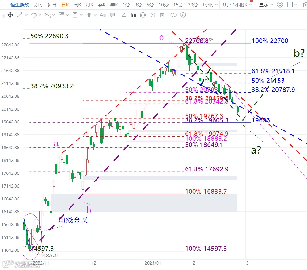 恒指自22700点开始的调整,上周跌破21342点后加速向下,目前基本可以确认其调整级别是针对14597低点的调整。同时,恒指、国指和科指都已经很接近去年10月底开始的整波反弹的0.382技术比例位置,三个指数的调整幅度基本同步。下周是这波调整的第5周周线级别时间窗口,下周一也是这波调整的21天时间窗口,所以下周一的盘面能否止跌非常关键,参考恒指19605点支撑不能跌破。