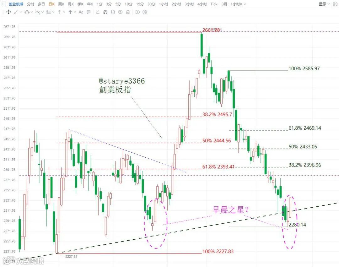 创业板在昨天的止跌十字星之后,今天开始高开冲高站上2310后,反复考验突破有效,午后继续上扬,收缩量中阳线。创业板指的反弹与12月下旬的K线有相似之处,好像都收早晨之星,能否有这样的反弹高度则有待日后的验证。创指这波反弹暂时看作2661下跌的波段的4浪弱反弹,后市注意创业板2393-2404区间压力能否突破,如果在2400附近区域受阻而结束反弹,后市还有一波最后的5浪下跌动作。
