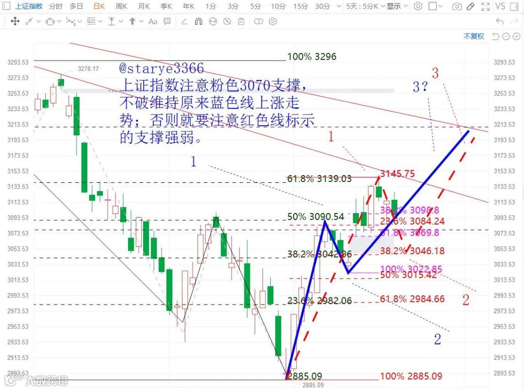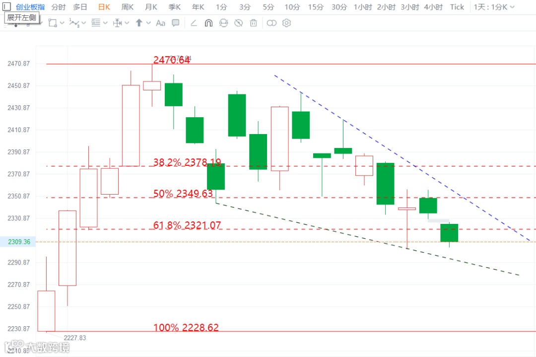 创业板指破2320支撑位,如图所示,极限不能破墨绿色虚线的支撑,约2300点,下周要看见放量向上突破蓝色虚线,才能确认结束调整。