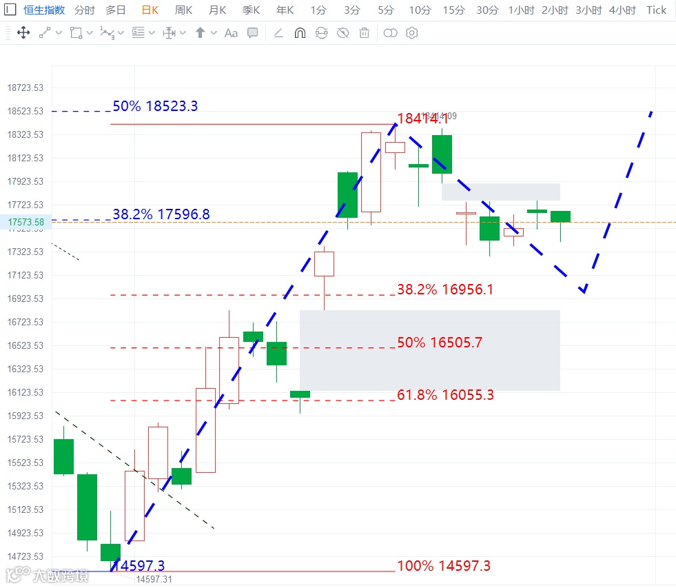 大方向上,恒指中期反弹趋势确立,结合MACD技术指标周线级别重上0轴,反弹结构未结构,整理之后仍会反弹,估计下周是先下后上的概率大。