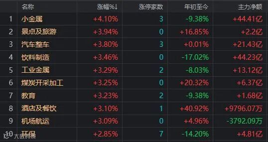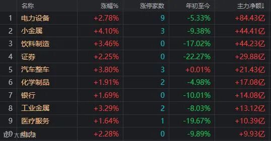 盘面上,板块普涨,没有下跌的板块,资金主要流入电力设备、小金属、饮料、证券、汽车整车等板块。