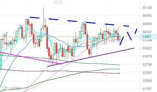 道指睇形态象是做收敛三角形,未来在33500-34200之间窄幅横行,短期内难以突破。