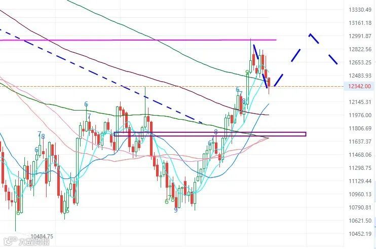 纳指回调曾跌破12300,向下面12000进发(大约是1月后反弹整段回调的0.382位),收盘市顶在12300之上。向上12800成为了大阻力,13000大关更是短期内大关,没什么大利好很难升上去。