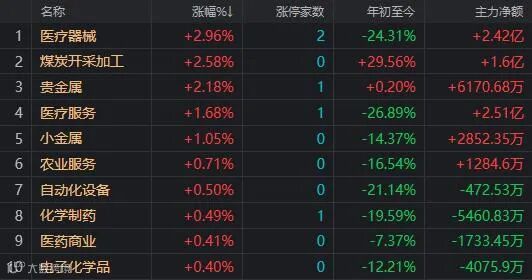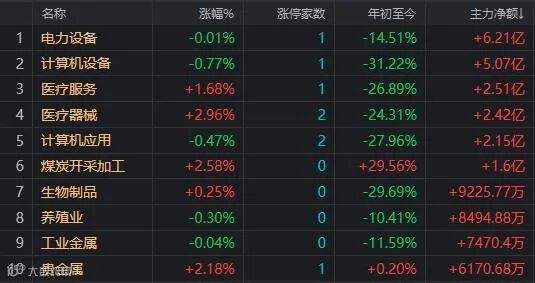盘面上,医疗器械、CRO概念、煤炭等板块涨幅居前,房地产开发及服务、港口航运、家电等板块指数跌幅居前。