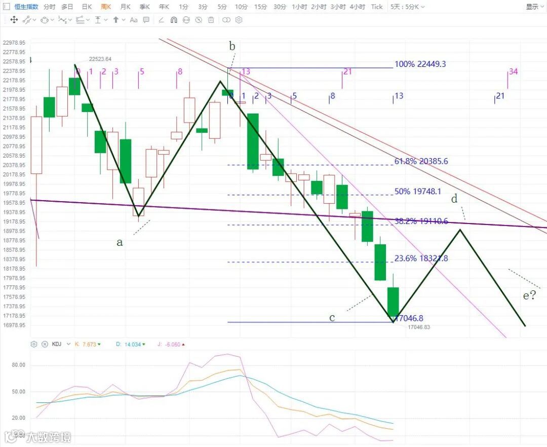如图所示,先按最悲观的预期(短期还会有新低)去预判,把后市可能的最坏的走势都考虑进去才不至于迷茫,这里如果出现d浪反弹走势,后市就看反弹的力度再来判断后面是否还有e浪下跌(或低点)。
