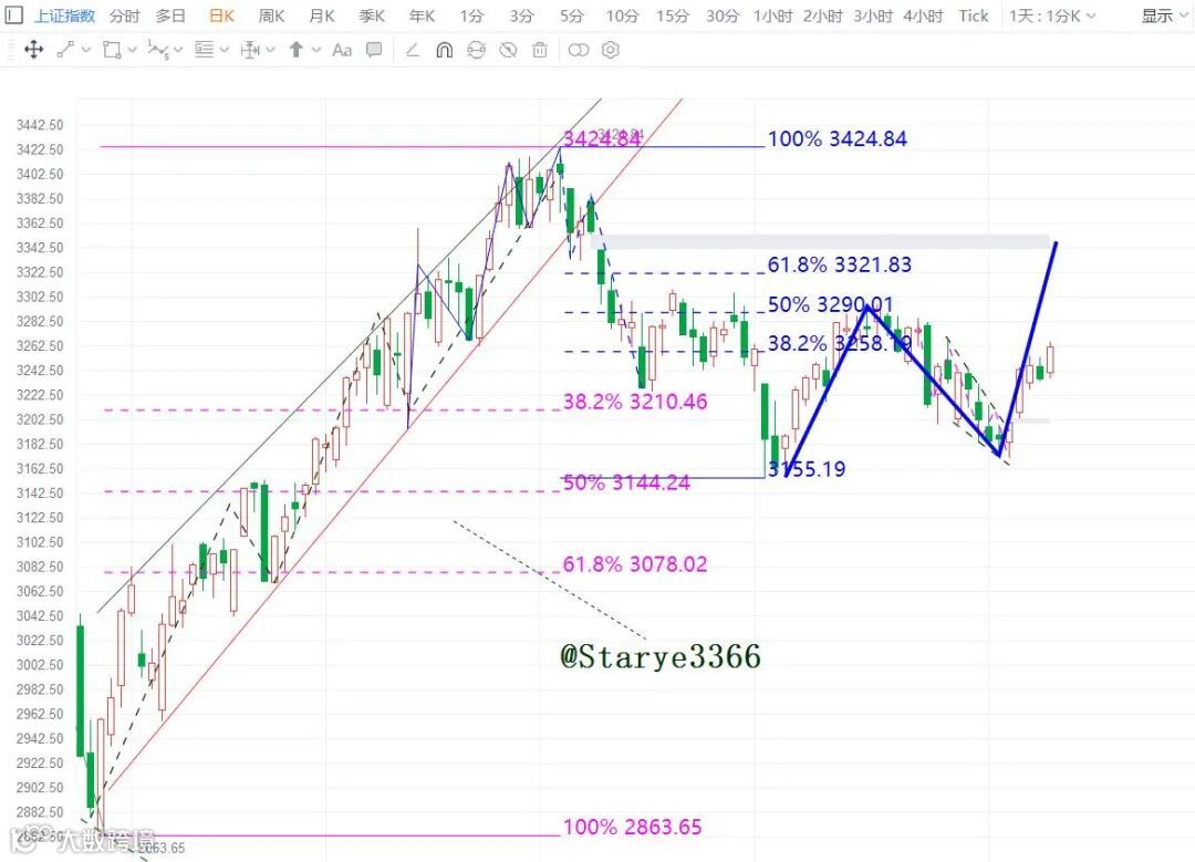 上证指数上周持续反弹,结构上延续在日线级别的3155小双底起来的反弹上涨结构中。
