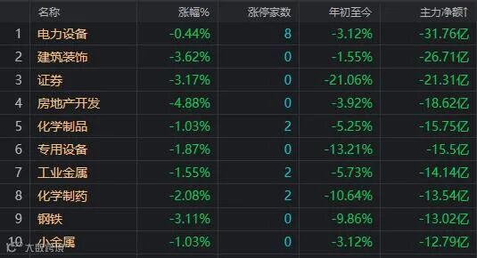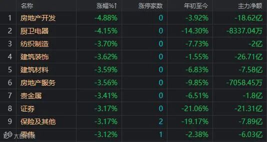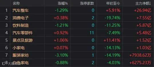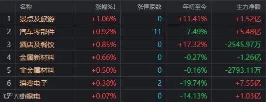 盘面上,只有景点旅游、汽车零部件、酒店餐饮、金属新材料、非金属材料、消费电子、小家电共7个行业板块上涨,房地产开发、厨卫电器、纺织制造、建筑装饰、建筑材料、房地产服务、大金融等板块跌幅居前。