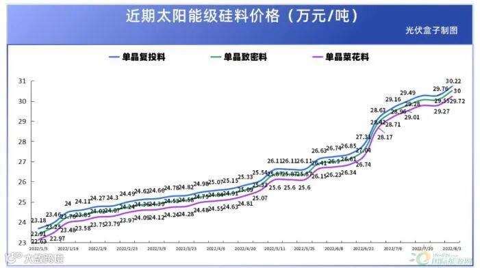8月3日,中国有色金属工业协会硅业分会公布了太阳能级多晶硅最新价格。单晶复投料主流成交价在30-31万元/吨,平均30.22万元/吨,周环比涨幅1.55%。单晶致密料主流成交价在29.8-30.8万元/吨,平均30万元/吨,周环比涨幅1.52%。
