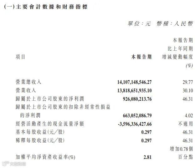 东方电气一季度营业总收入约141亿元(人民币.下同),升29.7%,纯利约9.26亿元,同比升约46.31%,每股盈利29.7分,扣除非经常性损益的净利润约6.63亿元,升约4%。