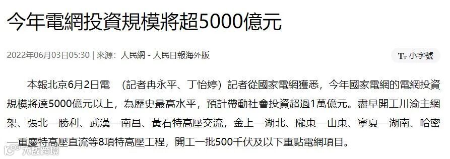 6月,为了稳经济保就业,国家电网提出今年电网投资规模将达5000亿元以上,为历史最高水平,预计带动社会投资超过1万亿元。