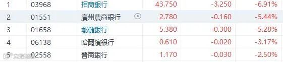 今日内银股表现很差,午后突然加速下跌,是港股创下全日低点的主因。其中招行(3968)跌6.9%,邮储银行(1658)跌5.2%,中银(3988)、交银(3328)及工银(1398)都跌超过1%。