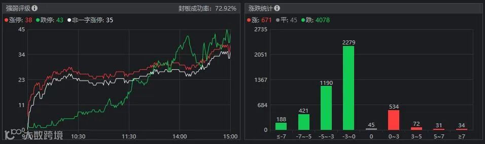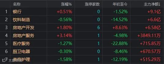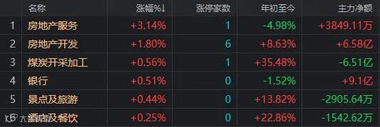 盘面上,只有房地产、煤炭、银行、景点旅游、酒店及餐饮几个行业板块上涨;电力设备、自动化设备、金属新材料、半导体及元件等19个行业板块跌幅大于3%。