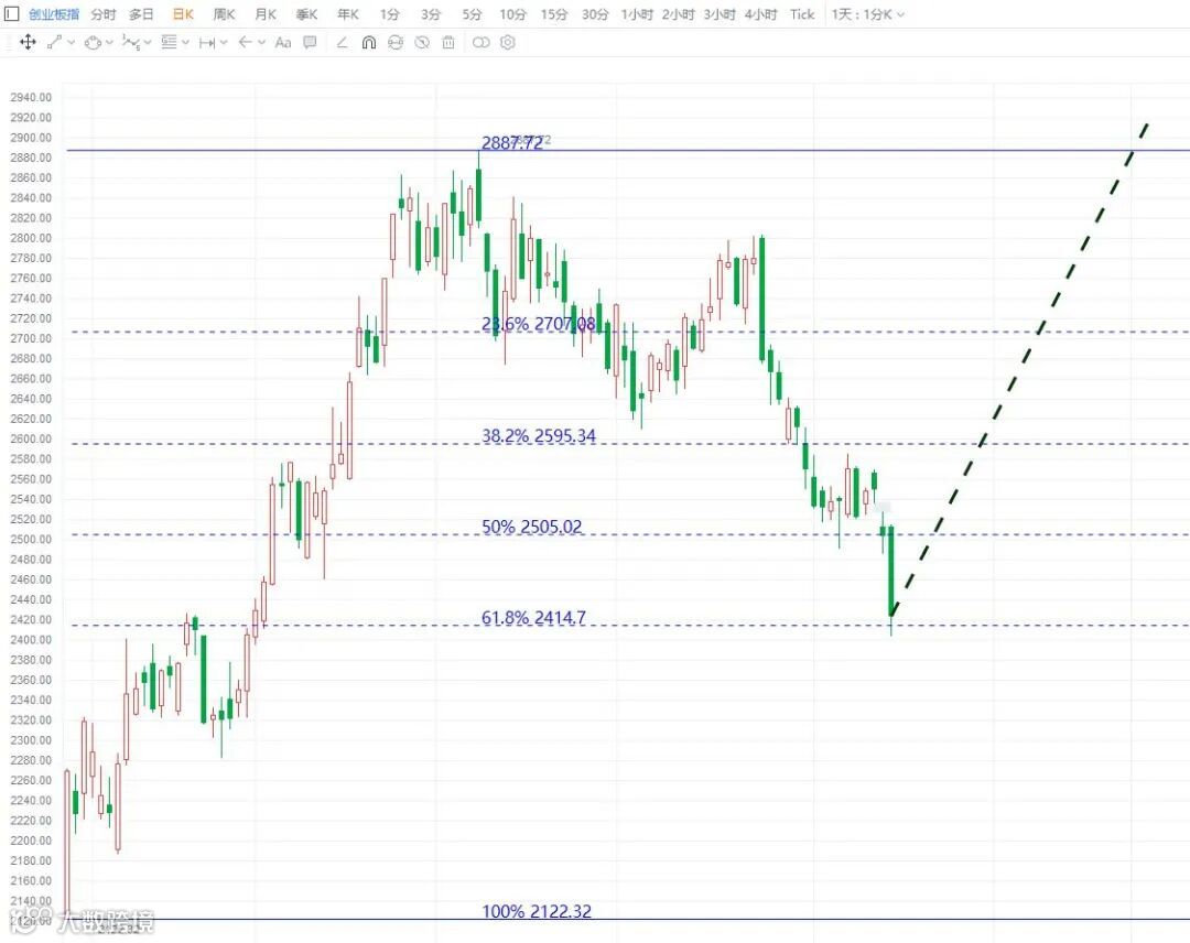 创业板指数如果还是针对2122低点的调整,最后的支撑防守位置就是2414点,今天盘中破了一下,但收盘还是没有跌破。创业板只能调整到这里了,又是只能上不能下,背水一战的境地,看明天能否绝地反击拉起。