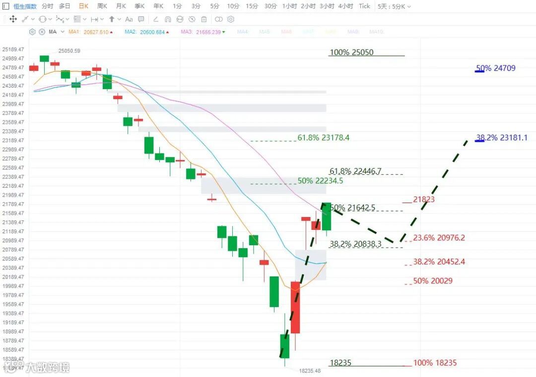 恒指今天高开低走,收盘再度回到上周五的开盘价位置,两天合并看,属于震荡整理走势。上周五分析,恒指分时上即将走完一组5浪反弹。从上午高开低走判断,分时5浪在21823点结束。短期调整针对18235低点开始的整段反弹的修正,注意周四裂口的支撑,最好就是不要回补,这个裂口在日K线级别很重要。日K线图上,恒指如果以时间换空间的方式调整,5日均线与10日均线,两条均线目前都在20500附近,等到它们金叉,同时又上移到20800附近,那麽均线、裂口、技术支撑位,三个条件合一,就能支撑指数继续向上。技术上,个人认爲恒指与上证走势相似,因此,整体上,恒指也是关注上周四留下的裂口的得失。具体点位,恒指调整在20500-20786区间有强支撑,短期的调整后,继续向上反弹。调整后的反弹主要注意23180附近的压力。如下图,红色字是支撑位,其他顔色是压力位。