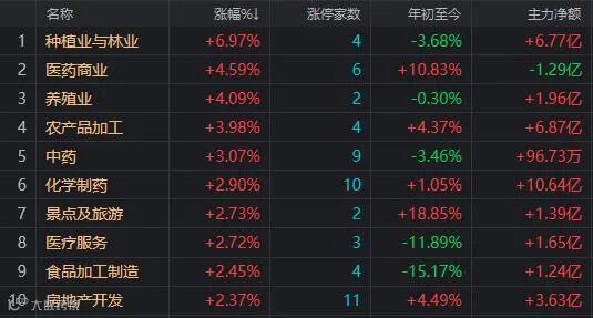 盘面上,行业板块普涨,种植与林业板块大涨,医药、中药、景点旅游、房地産、NMN概念、新冠治疗概念等板块涨幅居前,仅证券、银行、公路铁路运输、教育几个板块下跌。