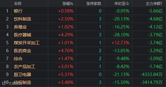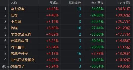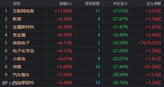 盘面上,所有行业板块上涨,电商、零售、家电、地产、元宇宙、锂电、光伏、券商等板块等集体大涨,资金流入电力设备、证券、半导体及元件等板块。