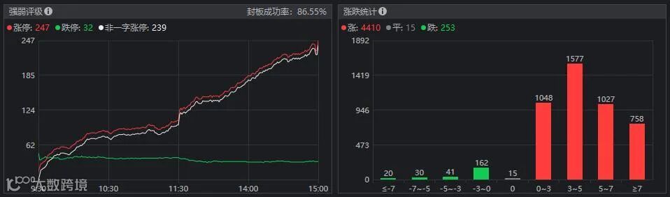29日,A股早盘横盘整理,午后开盘跟随港股快速拉升,随后高位再度横盘整理。盘面上板块和个股普涨,平盘与下跌个股合计不足300只,超过4400只个股上涨,涨幅大于7%个股758只,其中247只涨停,跌幅大于7%个股20只。市场全天成交额合计9651亿元,北向资金净买入42.46亿元。