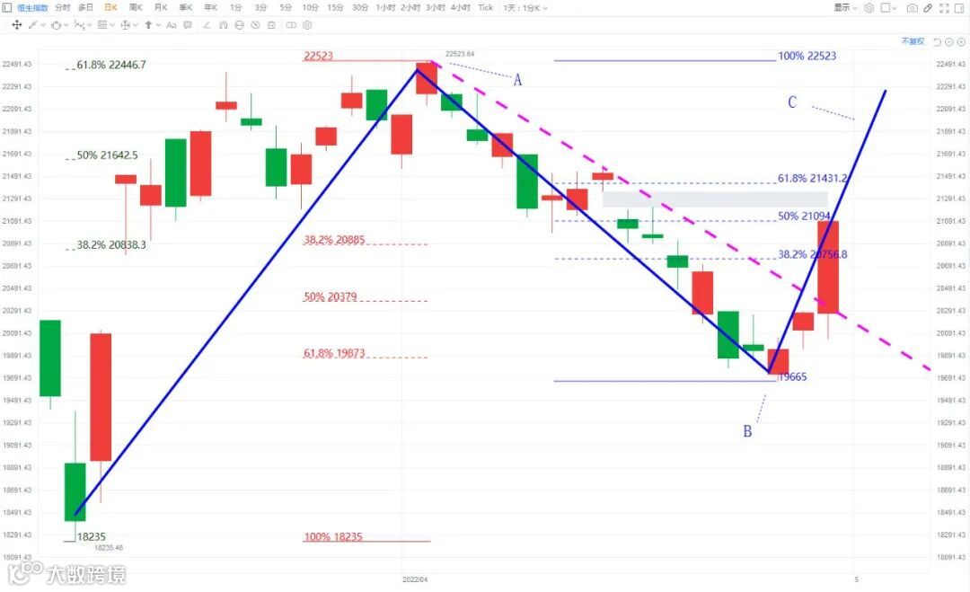 周三在雷神节目里,包括周三晚复盘,我都是觉得科指由于在周三早盘没能和恒指同步産生新低点,判断结构上还是参照恒指走势分析,或还有一次破前低点的动作。但是昨天早上盘前观点及时修正,认爲:结构上,它以5浪下跌结构开展二次探底,收盘已经突破压力连线的压制,虽然还没有突破4000点,但我宁愿相信已经完成二次探底。而且这两天的观点都是逢低做多策略,没有造成大错。今天两个指数放量大涨,向上突破,右侧确认二次探底完成,大C浪行情开始了,突破4月份的高点指日可待。