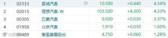 财政部、税务总局、工业和信息化部发布关于延续新能源汽车免征车辆购置税政策的公告,对购置日期在2023年1月1日至2023年12月31日期间内的新能源汽车,免征车辆购置税。理想汽车称预计第三季度车辆交付量约为25500辆,此前交付量预期为27000至29000辆。理想汽车称该更新主要由供应链限制所导致,公司车辆的潜在需求仍然保持强劲。理想(2015)调低了交付量股价不跌反升4.33%,收市报103.5元。其他汽车股普升,长城(2333)升4.34%,蔚来(9866)升0.86%,比亚迪(1211)及小鹏(9868)微升1%以内,吉利(175)微跌0.16%。