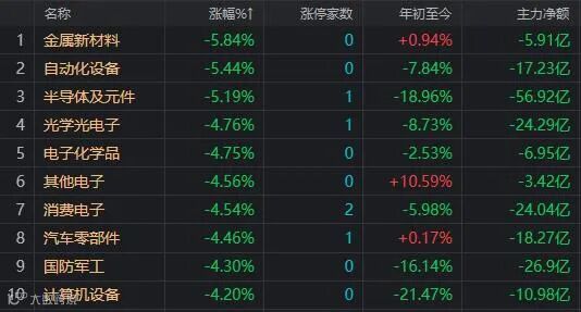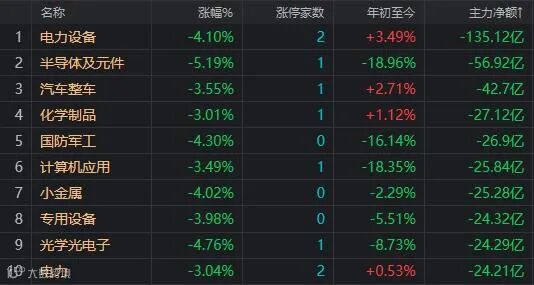 盘面上,只有种植与林业板块上涨,半导体及元件为代表的15个行业板块大跌4%以上。