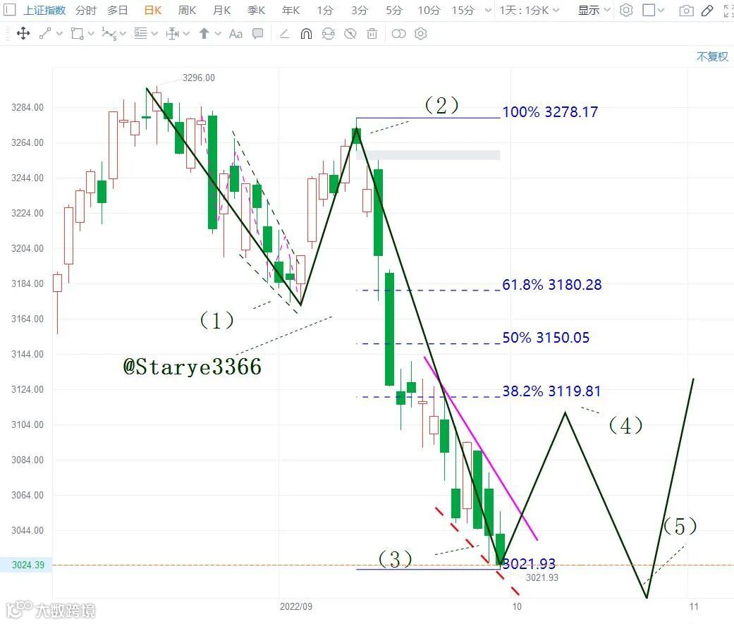 上证指数前期看作是针对2863低点的b浪调整,正常的良性调整只能调整到3078的这个点位。节前受多种因素影响,指数跌破了最后防守位置。但是,上证指数从9月13日3278点开始的调整已经超卖,市场应该有针对3278点的一波反弹。结构上,上证指数走势的浪形划分如图所示,也是之前就有给大家看过的浪形划分,目前还是判断后市走这个墨色实线路径的概率大。图中,指数处于粉红色实线与鲜红色虚线的楔形通道中,按图索骥,指数如突破粉红色实线上轨,则反弹开始,是否还有(5)浪下跌,则根据反弹高度决定后市走向。