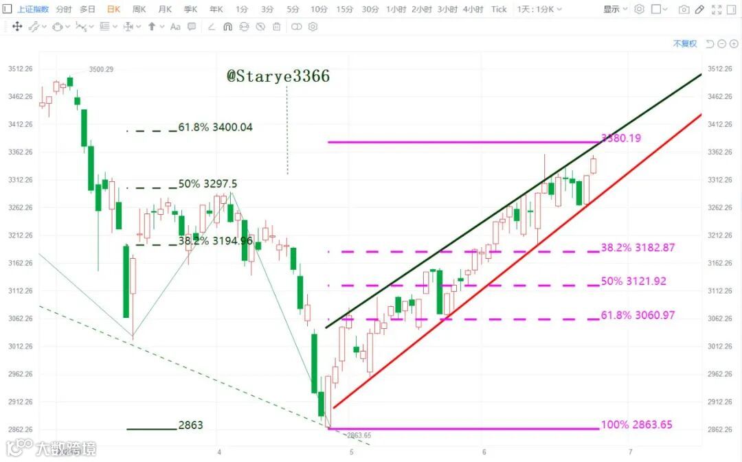 上周分析指出,自6月7日以来,市场进入了一个即有不断创出新高、又有不断创出新低的扩散型三角形调整行情中。熟悉K线形态的朋友都知道,三角型是市场调整结构,大多数出现在4浪中,是即将进入短期顶部的标志。除了形态、结构,还有结合已经反弹到0.618阻力附近的条件,判断即将见顶。目前,依然保持这个观点。因此,下周一是注意0.618阻力附近即3400点附近的压力;二是注意,上证指数仍然运行在一个楔形上涨通道当中,注意图中上轨(墨绿线)压力和下轨(红色线)支撑。如破下轨(红色线),是针对2863低点起来的反弹的一次调整。回调也不用太担心,不影响反弹大趋势,3200点附近区域有支撑。